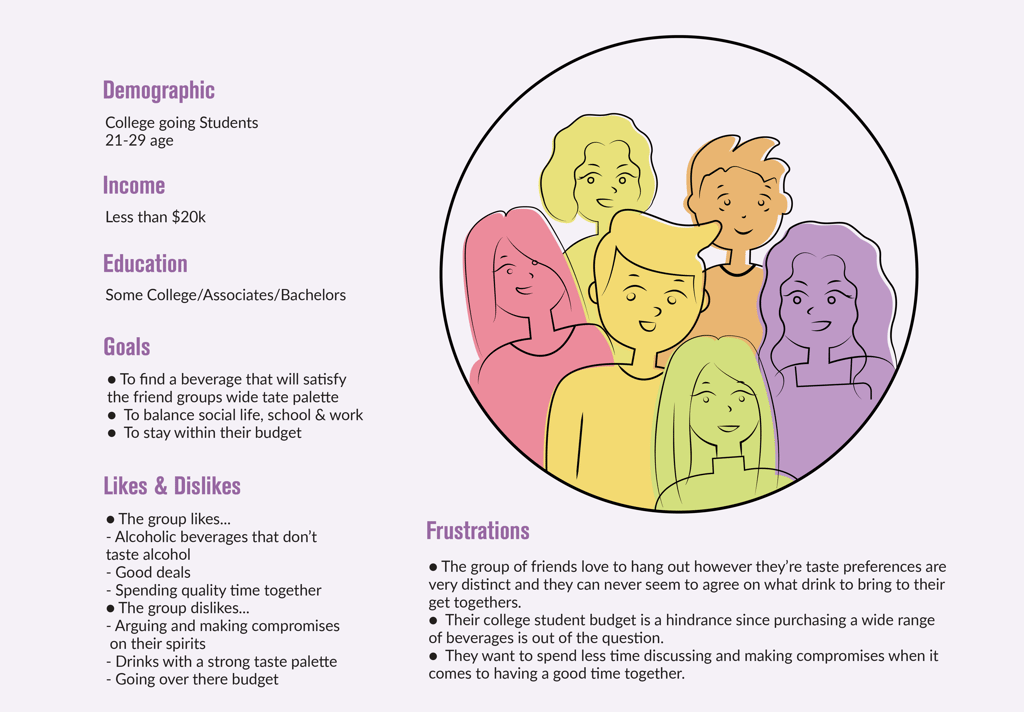 A majority of (60%) and 70% of legal age Millennial drinkers are a core demographic for hard seltzer. This helped us discover our target audience, college-going students, searching for a common alcoholic beverage that had a fruit-based flavor.